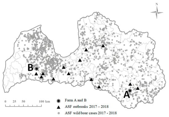 Farm A is located in south-east of Latvia, a farrow to finish farm with almost 6000 pigs, including nearly 600 breeding sows notified ASF suspicion to the veterinary authority on 14th July 2017 and the outbreak was confirmed by the veterinary authority at the same day. At that time, an active spread of the infection was ongoing in the local wild boar population [] (Figure 1). The closest ASF positive wild boar was found less than 3 km from the farm. Pigs were kept indoors in seven separate stables according to their production category (sows, boars, gilts and finishers). Sows were kept in three stables depending on their reproduction phase—sows for artificial insemination, pregnant sows kept in groups and farrowing sows. The farm had its own slaughterhouse located within the farm’s territory. The meat from the slaughterhouse was delivered to meat processing and retail establishments in Latvia.