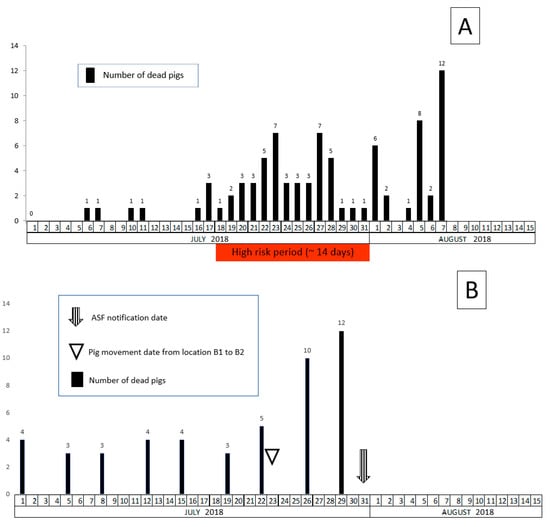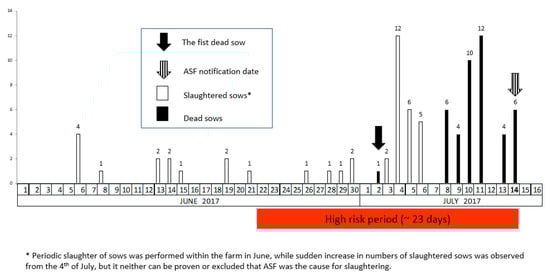 In case of an ASF outbreak, a timely epidemiological investigation has to be conducted to identify the possible source and to estimate the high risk period (HRP), which is the likely length of time that ASF has been present on the farm. It is very important to detect infected farms as early as possible after ASF virus introduction to avoid further spread and to minimize the losses to the pig sector and reduce governmental costs associated with outbreak eradication []. Animal experiments as well as field observations have shown that a low to moderate transmissibility of ASF virus between pigs is leading to a slow spread of the disease within a farm [,,,,,]. Therefore, the inadvertent introduction of the virus may remain unnoticed by the farmer or the veterinarian for extended time. Under unfavorable circumstances, the HRP may be several weeks or even months during which the virus can spread within a farm or to other farms.