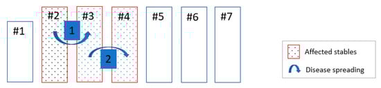 The potential spreading Scenario within Farm A is shown in Figure 4. Most probably, ASF infection started in stable 2 with a sow which aborted and died on the 2nd of July (index case). This sow came from the insemination stable 1 around 10–12 days before. However, the clinical status of the animals in the insemination stable as well as the laboratory results were not indicating an ongoing infection there. Pigs were moved from stable 1 to stable 2 using an outdoor path. It can be hypothesized that the index sow picked up infection from potentially contaminated environment during the outdoor walk. The path which connected two stables was badly constructed, with no solid floor and with partly damaged fencing, which may allow the inadvertent escape of pigs into the farm’s territory. If the farm’s territory was contaminated with ASF virus it was possible for pigs to get infected. After the index sow died, the sows from that pen were moved to other places within the same stable and they were the next ones who aborted and died.
