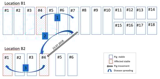 Reconstructing the potential spreading pathway of the virus within the farm may help to identify how and where the virus might have entered and to which degree the farm was affected. Additional blood or organ samples for laboratory examinations taken from suspect animals, from all production units during culling or shortly before, can prove the presence or absence of the virus in different farm units. However, under field conditions, sampling of pigs before culling or during culling is difficult because of time pressure and other logistical arrangements. In Farm A the ASF infection most probably started in the stable 2 and spread to the stables 3 and 4, while four other stables were not affected. For Farm B reconstruction of the virus pathway was more difficult compared to Farm A, mainly due to the complex epidemiological situation ongoing in parallel in the two separate locations. The clinical events started most probably in stable 4, location B1 and then jumped over via stable 7 to location B2. Direct contacts with infected live pigs or carcasses posed the highest risk of spreading the infection [,]. As in the case of Farm A, we could see how infection spread from one stable to the next following the movements of infected pigs. Non-compliance with farm biosecurity measures left space for virus introduction and spread within the farm (biosecurity [].
