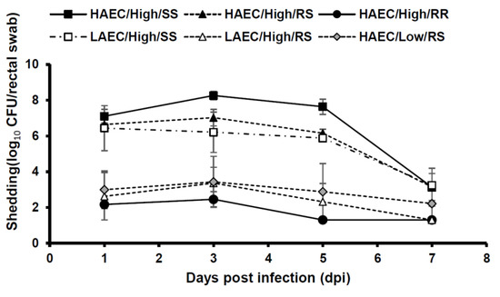 The number of bacteria shedding during the test period is shown in Figure 1. In SS pigs infected with highly adherent bacteria and challenged with 1010 CFU/pig, the average bacterial shedding count of 107 CFU/rectal swab and the high shedding continued to 5 dpi. RS pigs infected with highly and lowly adherent bacteria and challenged with 1010 CFU/pig showed 106 to 107 CFU/rectal swab and bacterial shedding up to 5 dpi. In all test groups, bacteria were shed at 104 CFU/rectal swab or less by 7 dpi.