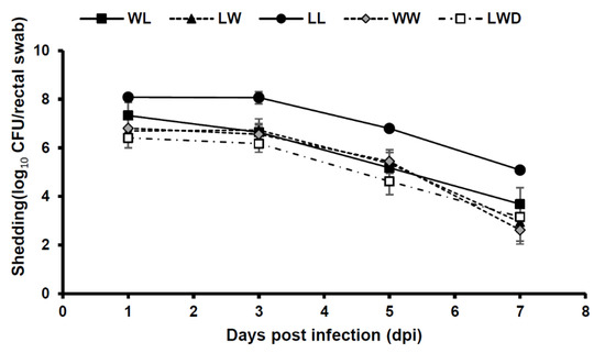 Figure 2 shows the number of bacterial shedding during the test period. The LL breed, which exhibited the highest mean fecal score and mortality rate, showed bacterial shedding of 108 CFU/rectal swab at 1–3 dpi. For the other breeds, no difference was found in the number of bacterial shedding.