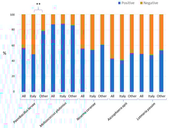 Frequency of the positive (presence of an amplified fragment, in blue) and negative (absence of an amplified fragment, in red) honey samples in the amplifications that targeted Paenibacillus larvae, Melissococcus plutonius, Nosema ceranae, Ascosphaera apis, and Lotmaria passim. “All” means that all 102 analysed samples were considered together; “Italy” means that only the 74 Italian samples were considered; “Other” means that only the remaining 28 non-Italian samples were considered. The two asterisks (**) mean that the difference of positive honey samples between the two contrasted groups was highly significant (p < 0.01).