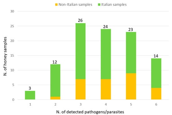 Number of honey samples that were positive for one to six pathogens/parasites differentiated between Italian samples (in green) and non-Italian samples (in orange). The total number of positive samples is reported at the top of each bar.