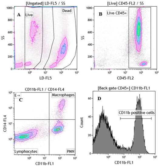 One-hundred microliters of the cell suspension at 1 × 106 cells/mL were incubated on ice for 30 min in the dark with a flow cytometric four-color panel: 5 µL of FITC-conjugated anti-CD11b (clone CC126, Bio-Rad), 5 µL of PE-conjugated anti-CD45 (clone CC1, Bio-Rad), 5 µL of APC-conjugated anti-CD14 (clone TÜK4, Miltenyi Biotec, Bergisch Gladbach, Germany); 1 µL of the Live/DeadTM Fixable Near-IR Dead Cell (Thermo Fisher Scientific, Waltham, MA, USA) was added to the mix solution and incubated for 10 min in the dark. After incubation, the cells were washed twice with 1 mL of cold PBS and resuspended in 300 μL of PBS for the flow cytometric analysis.