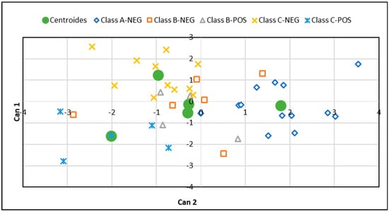 Figure 2 graphically represents the canonical analysis in a two-dimensional space. In the graph each sample is plotted according to its canonical variates and centroids represents the mean of the data points in each class. As shown by the plot, Group A-NEG was significantly separated from classes C-NEG and C-POS, with a p-value of the Mahalanobis distance of 0.002 and 0.001, respectively (Table 5). Furthermore, classes C-NEG and C-POS were significantly distant from each other, with a p-value of the Mahalanobis distance of 0.038 (Table 5). However, classes B-NEG and B-POS were not significantly distant from each other and from the other classes.