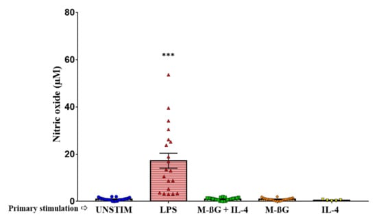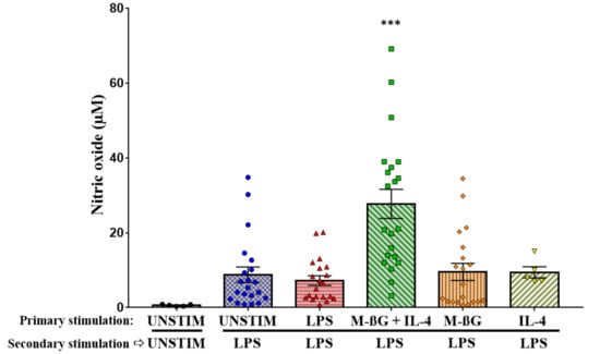 3.2. Primary Stimulation with β-Glucan Microparticulates and IL-4 Enhanced NO Production after Secondary Stimulation with LPS