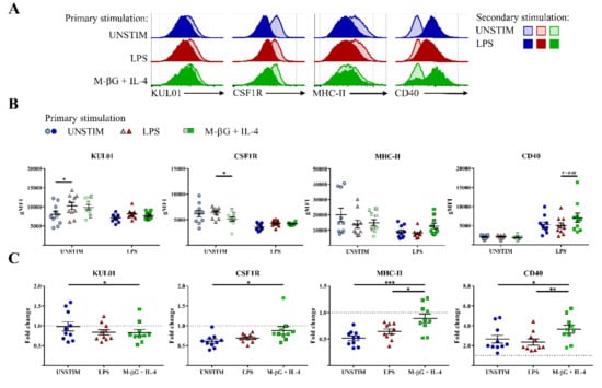 3.3. Primary Stimulation with β-Glucan Microparticulates and IL-4 Influenced CD40, MHC-II and CSF1R Surface Expression after Secondary Stimulation with LPS
