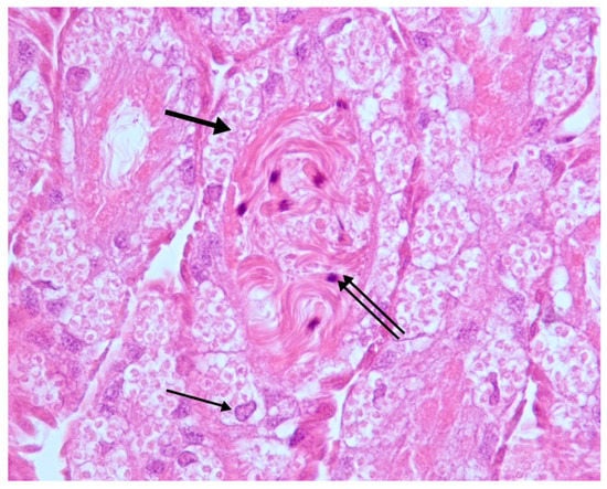 Twenty-five adult drones of A. m. ligustica were collected in 5 different apiaries located in Campania (Italy) (5 drones/apiary) from March to June 2019, a time-span that includes the natural reproductive season of local honeybees. Apiaries were located in small beekeeping farms (less than 30 hives) surrounded by orchards and tomato crops. Drones were individually collected from apparently healthy hives, with low levels of V. destructor infestation (<2%) and absence of clinical signs of viral and N. apis infection. Insects were selected according to size, vitality, and absence of visible clinical signs of pathologies such as trembling, deformed wings, and swollen abdomens. They were manually caught from the comb and subsequently transported in sterile tubes to the laboratory of Veterinary General Pathology and Anatomical Pathology of the Department of Veterinary Medicine and Animal Productions, University of Naples “Federico II”. All drones were anesthetized with chilling for 3 min at −20 °C [], observed at the stereomicroscope (Zeiss Stemi 305 trino, New York, NY, USA) to detect the presence of macroscopic alterations, and whole-body mass was weighted to assess age according to Metz and Tarpy []. Samples were then placed in tubes containing 10% buffered formalin for 1 h for histopathological examination. Subsequently, they were individually injected with 10 μL of 10% buffered formalin using a micropipette (Accumax Smart, Dantali, India) and a 10 μL tip. While holding the thorax of the drone between the thumb and the index finger of one hand, the injection was performed laterally between the 3rd and 4th tergite, holding the tip parallel to the tergite in order to avoid puncturing of the gut and contamination of specimens with pollen and feces []. After injection, drones were moved to a tube containing 10% formalin. After 24 h, each sample was cut lengthwise, placed in an embedding cassette, and then in an automatic embedding processor (VTP300, Bio-Optica, Milan, Italy). For each half, paraffin blocks were manually created using an embedding console system, and 3 μm thick sections were obtained with a microtome. In order to facilitate sectioning, a disposable stainless-steel blade (N35, Feather, Osaka, Japan) for fine cuts of hard tissues was used. Single sections were placed on the surface of hot water and then collected on a slide and dried at room temperature for 12 h. Slides were mechanically stained with hematoxylin and eosin (H-E) using an automatic tissue slide stainer (ST5010 Autostainer XL, Leica, Germany) and finally mounted. Tissue preparations were observed by light microscopy (Nikon Eclipse E-600, Nikon, Tokyo, Japan). Although observation focused on the testes, all tissues were analyzed for the presence of visible pathogens, i.e., Nosema spp.