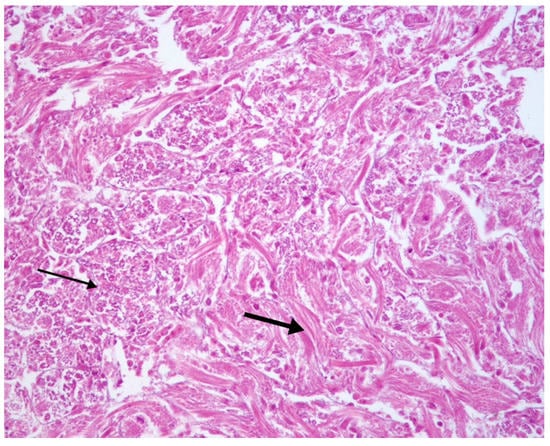 Five samples showed clear degenerative phenomena affecting the seminiferous tubules. In other species, degenerative alterations have been associated with high levels of heavy metals and pesticides, such as organophosphates or neonicotinoids [,], in the environment which could induce oxidative stress in tissues. Oxidative stress occurs following the accumulation in organisms of reactive oxygen species (ROS) which can determine high molecular damage, degeneration of tissues, and premature aging []. It has been shown that drones are able to survive acute oxidative stress due to individual tolerance and resistance, and not to repair of oxidative damage of lipids and of cells [], thus leading to a subclinical disease.