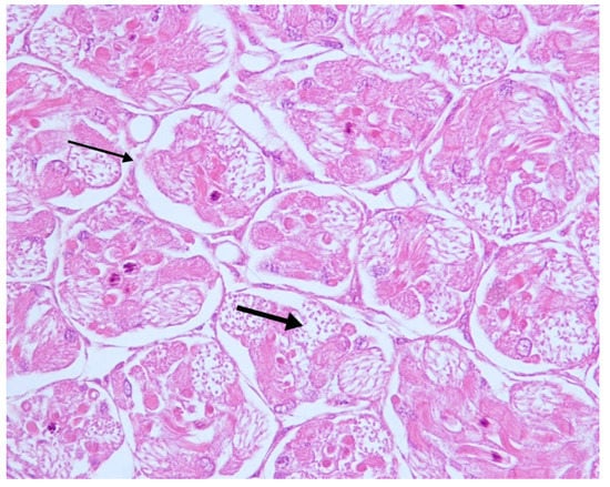 To date, many studies have focused on the viability and motility of spermatozoa, given the increasing interest of beekeeping in instrumental insemination, and little importance has been given to the study of possible alterations of spermatozoa [] and not much is known about pathological changes in the microscopic structure of reproductive organs which could lead to the formation of altered spermatozoa.