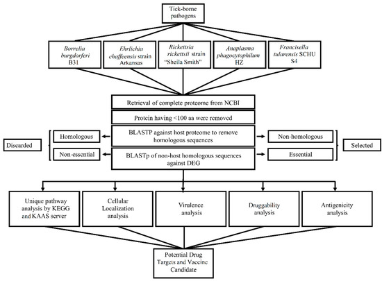 Vaccination is a promising and sustainable approach to controlling ticks and TBPs [27,28]. Various in silico and drug design approaches have generated a plethora of data by eliminating the time and cost involved in trial and error experimentations during a drug or vaccine development [18,29,30,31,32,33,34]. Inceptive steps in the discovery of a novel drug target or vaccine candidates include the identification of target proteins [35]. To the best of our knowledge, limited studies have been reported using subtractive proteome analysis for the identification of drug targets or vaccine candidates against TBPs such as B. burgdorferi ZS7 [36] and Rickettsia rickettsii [37]. The purpose of this study is an in silico approach using subtractive proteomics for the prediction of potential drug targets and vaccine candidates against TBPs.