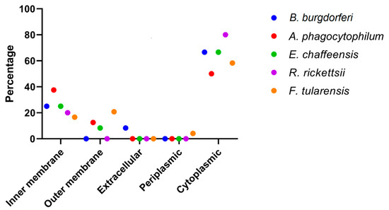 For the prediction of effective and suitable drug targets and vaccine candidates, it is vital to find the protein’s subcellular localization [84]. Extracellular, membrane-bound, and cytoplasmic proteins can be used as vaccine candidates and drug targets, respectively [18,51]. In B. burgdorferi B31, the CELLO server analysis predicted 8/12 (66.66%) proteins were cytoplasmic, 3/12 (25%) inner membrane, and 1/12 (8.33%) extracellular. In A. phagocytophilum HZ, 4/8 (50%) were cytoplasmic, 3/8 (37.5%) inner membrane, and 1/8 (12.55%) outer membranes. In E. chaffeensis str. Arkansas, 8/12 (66.6%) were cytoplasmic, 1/12 (8.33%) outer membrane, and 3/12 (25%) inner membrane. In R. rickettsii str. “Sheila Smith”, 4/5 (80%) were cytoplasmic, and 1/5 (20%) inner membrane. In F. tularensis SCHU S4, 14/24 (58.33%) were cytoplasmic, 5/24 (20.83%) outer membrane, 4/24 (16.66%) inner membrane, and 1/24 (4.16%) periplasmic (Figure 2). Cytoplasmic proteins have been suggested as favorable drug targets compared to membrane-bound proteins, because the latter often faces problems during purification [85].