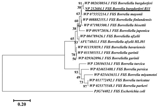 The amino acid sequence of the vaccine candidate (B. burgdorferi B31 FLiS protein) identified in this study was scanned for homologous sequences by BLASTp at NCBI. The homologous sequences were downloaded in FASTA format and were aligned using ClustalW in BioEdit Sequence Alignment Editor v.7.0.5 [63]. The evolutionary relationship of sequences was constructed using the neighbor-joining method in MEGA v. X [64] with bootstrapping at 1000 replications [65].