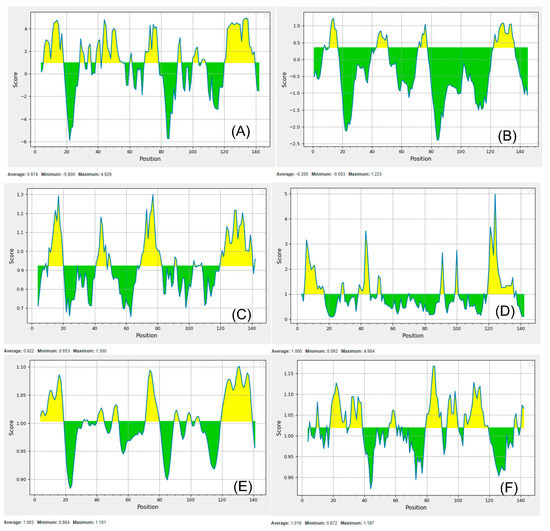Among the twelve targets after cellular localization, five proteins were cytoplasmic, five inner membranes and only one protein was each outer membrane and extracellular. In the adhesion and invasion mechanism during the host–pathogen interaction, outer membrane proteins played a significant role in invading a host cell and entering the tissue [21]. Comparatively, it was evident from previous reports that outer membrane proteins are vaccine candidates and that cytoplasmic proteins are drug targets [21,109]. It is well known that exported proteins are the prominent molecules of interaction with cells infected by pathogens; therefore, they are potential candidates for vaccine targets [110,111,112,113,114]. The antigenicity and allergenicity analysis of target proteins revealed that eight among them were antigenic while the remaining four proteins were non-antigenic and all the target proteins were non-allergen (Table 2). The FLiS protein in B. burgdorferi B31 has several antigenic epitopes having the potential as a vaccine candidate. The extracellular protein (FLiS; UniProt ID: O51500_BORBU, accession no, NP_212684.1, KEGG ID: BBU02040) was found with a high antigenic score of 0.42 as well as human non-allergen. Potential T-cell epitopes were predicted within the FLiS protein for the prediction of an epitope-based subunit vaccine. The molecular weight of the FliS protein was 16.45 kDa, while the theoretical pI was measured as 9.20 which indicated that this protein should have a negative charge. The half-life of the vaccine was expected to be more than 10 h in E. coli in vivo. The estimated rate of extinction and an aliphatic index were 15,470 and 115.66, respectively. The protein’s computed GRAVY value was −0.253 while the index of instability (34.07) classified the protein as stable. The results of predicted B-cell epitopes of FLiS protein are shown in (Figure 4).
