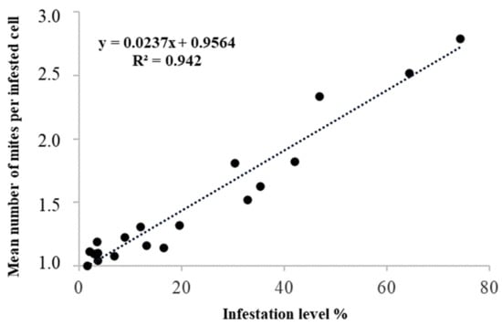 The number of sealed brood cells, infested brood cells, and foundress mites in each of the 19 inspected combs, the percentage of infestation per comb, and the mean number of female mites per infested cell are given in Table 1. The infestation level of Varroa ranged from 1.7% to 74.3% in the inspected combs, and the mean number of foundress mites per infested cell varied from 1 to 2.8 (Table 1). Between these last two variables, a highly significant, linear and positive, relationship (Df = 1; F = 277.4; p < 0.00001) was observed (Figure 1), with approximately 94% of the variability of the mean number of foundress mites per infested cell explained by the infestation level (R2 = 0.942). This relationship clearly shows that as the level of infestation increases, the phenomenon of multi-infestation increases.