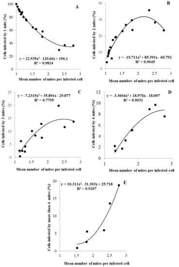 The second-degree polynomial curves (Figure 2A–E), all highly significant (p < 0.0001), allow us to evaluate the distribution of the foundress mites inside the brood cells for different infestation levels. In fact, we can observe that when the level of infestation increases, the progressive decrease in the percentage of cells containing only one mother mite (R2 = 0.9824; Figure 2A) is compensated by the growth of cells containing two (R2 = 0.9045; Figure 2B), three (R2 = 0.7795; Figure 2C), four (R2 = 0.9031; Figure 2D) or more than four (R2 = 0.9207; Figure 2E) foundress mites.