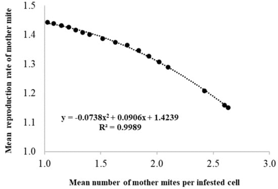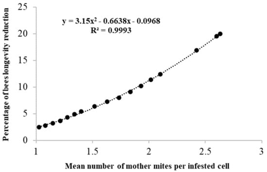 The regression equations obtained were used to derive two other second-degree regression equations, useful to describe the mean reproduction rate (fecundity) of female mites and the percentage of longevity reduction of adult bees parasitized by mites in the preimaginal stage as a function of the mean number of mother mites per infested cell. In order to develop these two equations, we simulated 17 different distributions of foundress mites, considering a constant number of cells available for invasion (1000) and an increasing number of mites (from 10 to 2500). After that, the average fecundity of foundress mites for each mite distribution was calculated considering the following average values of mite offspring: 1.45, 1.32, 1.25, 0.87, and 0 mites in cells with one, two, three, four, and more than four foundress mites, respectively []. To calculate the average longevity of workers that have emerged from the infested cells, the following percentage reduction in lifespan was considered: 2%, 10%, 20%, 40%, and 80% in cells with one, two, three, four, and more than four foundress mites, respectively [].