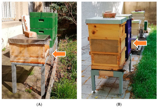 Colony 1 was situated next to two polystyrene hives on a 0.5-m-high metal stand in a wooden Zander hive. The hive consisted of one honey super and two brood chambers with ten frames each. It stood in an institute courtyard in an area with many chestnut, robinia and linden trees in the south of the city (Figure 1A). The entrance holes were oriented to the south.