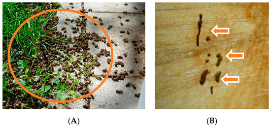 At the front of the first colony’s hive, additionally some scattered dark brown feces were visible (Figure 2B).