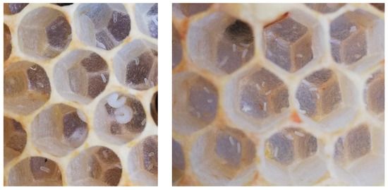 In contrast to colony 1, colony 2 started storing honey (approximately 4.1 kg) in the honey super. During the course of the disease, the dead queen of colony 2 was found in front of the hive on 10 May 2019. Later on, worker bees started laying eggs into the cells of colony 2 (Figure 4).