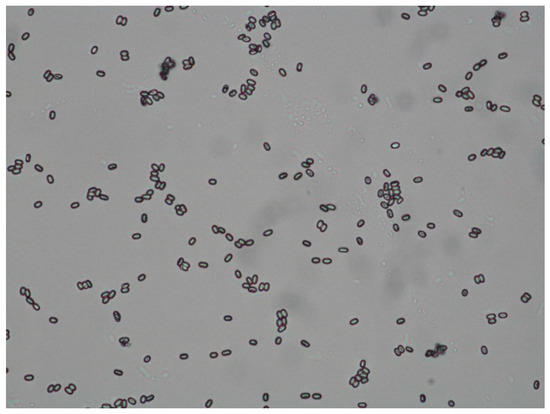 A microscopic estimation of the number of spores was carried out using the scheme described by Ritter in 1996 [19]. Colony 1 had a moderate infestation (between 20 and 100 spores per visual field), Colony 2 was only slightly affected (less than 20 spores per visual field) (Figure 5). For further differentiation of the species N. apis and N. ceranae, a PCR would be required, but was not performed in this case.