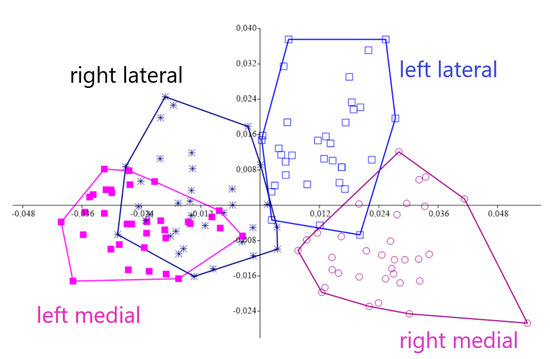 Procrustes ANOVA, for assessing measurement errors, showed that the mean square for interaction effect exceeded the measurement error; thus, the measurements were deemed reliable. There appeared to be directional asymmetries (DA, “side” effect) and fluctuating asymmetries (FA, interaction effect) in each right and left forelimb. Net asymmetry (DA + FA) accounted for more than 90% of the total variation, with DA being more than twenty times bigger than the value of FA (Table 1). In the PCA, the first two principal components represented 46.80% of the total shape variability (Figure 2), with Principal Component 1 (PC1) accounting for the most significant variance, 31.04% (Figure 3). The primary shape characteristic of the dataset, as represented by the first PC, may be interpreted as a horizontal displacement of distal landmarks—landmarks 3, 4, 7 and 8 on the distal and middle phalanges showed the highest contribution to variance—with a more marked displacement towards the right (Figure 4).