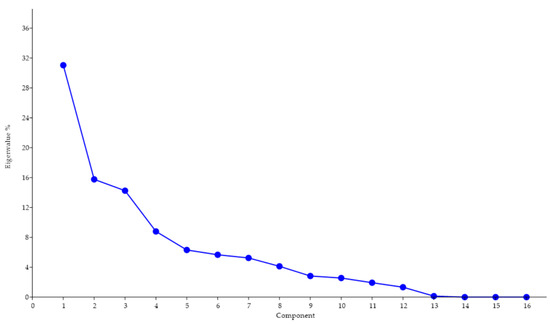 Screen plot showing the proportion of the total shape variance explained by each PC for 17 pairs of distal forelimbs belonging to Pyrenean Brown calves. There was a gradual decrease in the percentage of variance. The first two PCs accounted for 46.80% of the total variation.