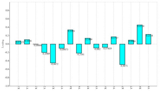 Loadings for the first PC, which accounted for 76.17% of the total observed variance for each of the eight studied landmarks (expressed in x, y Cartesian coordinates). Distal landmarks—on distal and middle phalanges, landmarks 3, 4, 7 and 8—showed the highest contribution to variance, with a horizontal (x) displacement tendency.