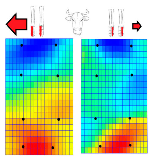 Representation of bending energy (contraction, bluish coloration and expansion, reddish coloration) for 17 paired limbs from 17 Pyrenean Brown calves (dorsal views). The right lateral series and left medial series on the left (above) appear on the left net frame (down) and the left lateral and right medial series (above) appear on the right net frame (down). The black dots equate to the previous landmarks (see Figure 1). We observed displacements of distal phalanges with a tendency towards abaxial displacements for paired acropodial series, which were more marked towards the right.