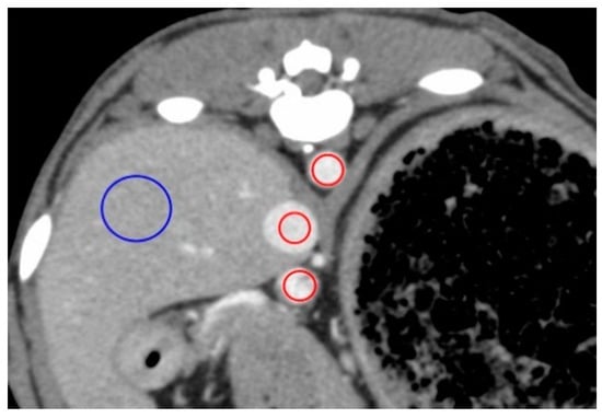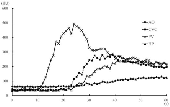 All CT images were reviewed on a dedicated DICOM viewer (OsiriX MD, Pixmeo SARL., Bernex, Switzerland). Contrast enhancement measures were obtained at the following regions of interest (ROIs; Figure 1): 40 mm2 area at the center of the AO, PV, and CVC, and a 200 mm2 area in either the left of right lateral lobe of the liver for HP measures, avoiding the hepatic vessels. All measures in the regions of interest (ROIs) were recorded in Hounsfield units (HU). The following time-based parameters were also measured from the time of contrast medium injection: first appearance of AO enhancement (AO-EA) and the AO enhancement peak (AO-EP); first appearance of CVC enhancement (CVC-EA) and the CVC enhancement peak (CVC-EP); first appearance of PV enhancement (PV-EA) and the PV enhancement peak (PV-EP); and first appearance of HP enhancement (HP-EA) and HP enhancement peak (HP-EP). The time-attenuation curve (TAC) was calculated based on all measured values in the ROIs.