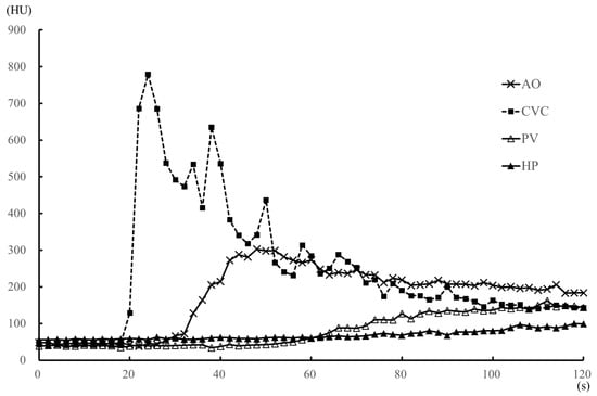 Median values of the time-attenuation curve (TAC) for the medetomidine sedation (medetomidine) protocol within 2 min after injection of the contrast medium, in five dogs. The TAC was generated from the median contrast values of the aorta (AO), caudal vena cava (CVC), portal vein (PV) and hepatic parenchyma (HP). The enhancement of the CVC was earlier than that of the AO, with a strong CVC enhancement peak.