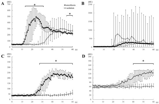 Comparison of the time-attenuation curve of the aorta (A), caudal vena cava (B), portal vein (C), and hepatic parenchyma (D) between the anesthesia (propofol and sevoflurane) and sedation (medetomidine) protocols, obtained within 1 min of the injection of the contrast medium, in five dogs. HU, Hounsfield unit; *, p-values < 0.05.