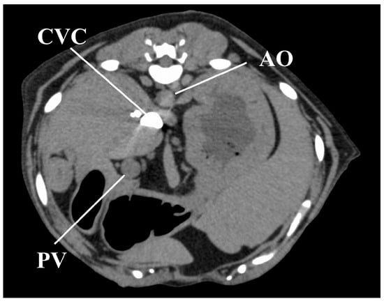 Image obtained 11 s after injection of the contrast medium in one representative dog under the sedation protocol, showing a strong CVC enhancement, with no contrast in the AO and PV. AO, aorta; CVC, caudal vena cava; PV, portal vein.