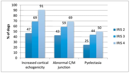 For 6/10 ultrasound abnormalities (irregular contour, abnormal C/M junction, abnormal C/M ratio, increased cortical echogenicity, abnormal medullary echogenicity and pyelectasia), a significant increase in their prevalence was found with the progression of the CKD IRIS stage (Table 2). In the different CKD IRIS stages, the most prevalent US abnormalities were increased cortical echogenicity, abnormal C/M junction and pyelectasia (Figure 2).