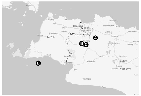 Map of western part of Java pointing NHP facilities in this study: Jonggol (A), Darmaga (B), Lodaya (C), and Tinjil Island (D).