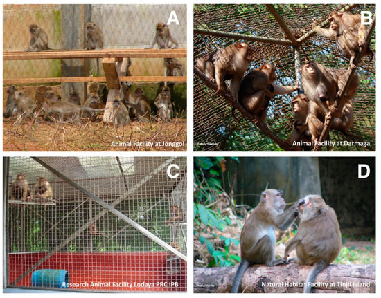 Cynomolgus macaques (Macaca fascicularis, A and D) and pig-tailed macaques (Macaca nemestrina, B and C). Jonggol, Darmaga, and Lodaya facilities (A–C) are captive enclosures, whereas Tinjil Island is a natural habitat facility (D). Photos courtesy of Entang Iskandar and RAFL PRC IPB.