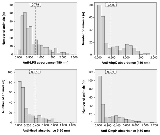 Distribution of absorbance values representing IgG against B. pseudomallei proteins; lipopolysaccharide (LPS), alkyl hydroperoxide reductase subunit C (AhpC), hemolysin-coregulated protein 1 (Hcp1), and putative outer membrane porin protein (OmpH). Vertical striped lines describe the cut-off value of each assay at a 99.7% confidence interval.