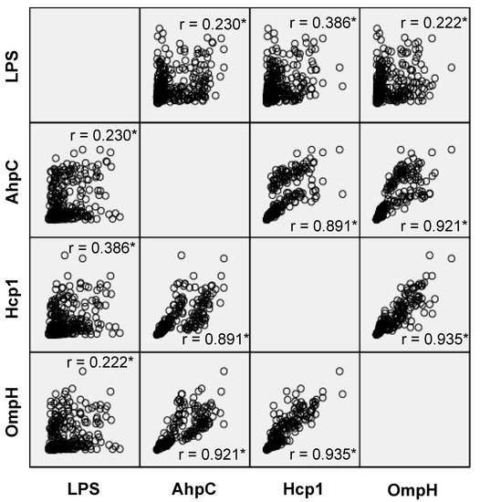 The relationship between the four assays is described in Figure 4. There were significant correlations between each assay. Strong positive relationships were observed among AhpC, Hcp1, and OmpH assays, with Spearman’s correlation coefficients of 0.891, 0.921, and 0.935 for AhpC-Hcp1, AhpC-OmpH, and Hcp1-OmpH, respectively. However, such a strong correlation was not observed between LPS and the three other assays. Spearman’s correlation coefficients between LPS-AhpC, LPS-Hcp1, and LPS-OmpH were 0.230, 0.386, and 0.222, respectively.