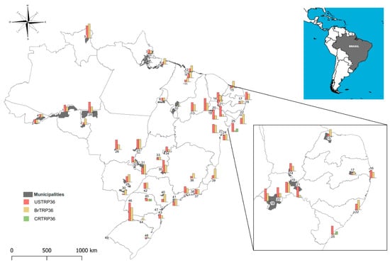 Despite the low detection of antibodies against the Costa Rica genotype in our study (n = 5; 0.61%), this genotype may also have been a target of genetic recombination, since its amino acid sequence is similar to that of BrTRP36 [9,18]. In Brazil, this genotype was found pointwise in Aracajú—northeast region (three dogs) and Londrina—south region (two dogs). The genotype CRTRP36 was first detected in the blood of human donors in Costa Rica, exhibiting a potential zoonotic relationship [9]. However, data from South American serosurveys reveal evidence of infection by this genotype only in dogs from Colombia and Peru [11,19].