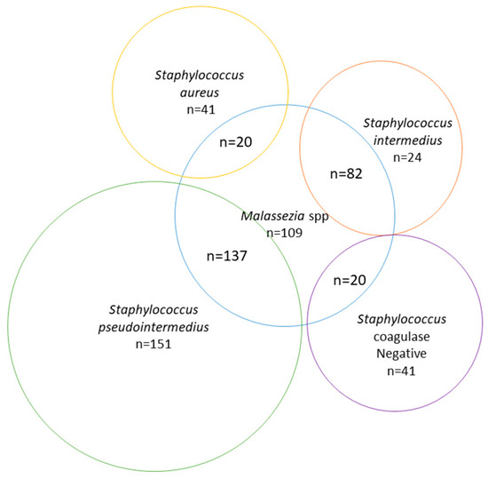 - Ludwig, C.; De Jong, A.; Moyaert, H.; El Garch, F.; Janes, R.; Klein, U.; Morrissey, I.; Thiry, J.; Youala, M. Antimicrobial susceptibility monitoring of dermatological bacterial pathogens isolated from diseased dogs and cats across Europe (ComPath results). J. Appl. Microbiol. 2016, 121, 1254–1267. [Google Scholar] [CrossRef]