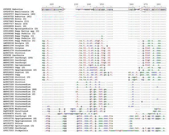An in silico analysis was done on all available Brucella and closely related species. This included 132 Brucella sequences and 126 closely related species (O. anthropi, O. intermedium, O. oryzae, O. otitici, O. ogrignonense, O. spp, S. virus, O pituitosum, C. tokpelaia). The BLAST® analysis of the 16S-23S rDNA ITS region of our selected reference returned 391 sequences. Sequences that were less than 15 bases were deleted and identical sequences were collapsed, resulting in 258 sequences.