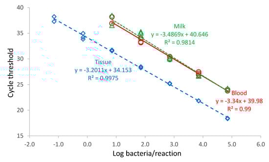 A ten-fold serial dilution of B. abortus (10−8–100) was prepared from a stock solution in PBS. Blood, milk, and tissue sample matrices were spiked with various dilutions of Brucella abortus. Amplification of the DNA was linear for positive results within the range tested, i.e., Log10 −0.15 to Log10 4.55 bacteria/reaction (blood and milk) and Log10 −1.15 to Log10 4.85 bacteria/reaction (tissue) (Figure 2). This was equivalent to Log10 2.20 to Log10 7.20 bacteria/mL blood or milk, and Log10 1.20 to Log10 7.20 bacteria/mL digested tissue. The efficiency of the PCR assay was 105% in tissues, 99% in blood, and 93% in milk.