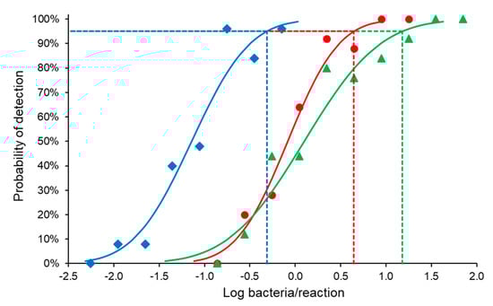 The analytical sensitivity was determined by preparing two-fold serial dilutions from Log10 4.20 to Log10 1.49 bacteria/reaction (blood and milk) and Log10 −0.15 to Log10 −2.85 bacteria/reaction (tissue). The 95% LOD of the assay was 4.43 Brucella organisms/PCR reaction in blood, 15.18 in milk, and 0.49 in tissues (Figure 3 and Table 4).