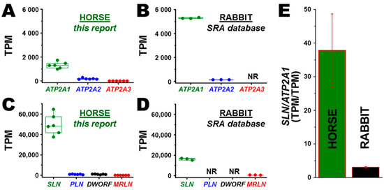 - Valberg, S.J.; Soave, K.; Williams, Z.J.; Perumbakkam, S.; Schott, M.; Finno, C.J.; Petersen, J.L.; Fenger, C.; Autry, J.M.; Thomas, D.D. Coding sequences of sarcoplasmic reticulum calcium ATPase regulatory peptides and expression of calcium regulatory genes in recurrent exertional rhabdomyolysis. J. Vet. Intern. Med. 2019, 33, 933–941. [Google Scholar] [CrossRef] [PubMed]