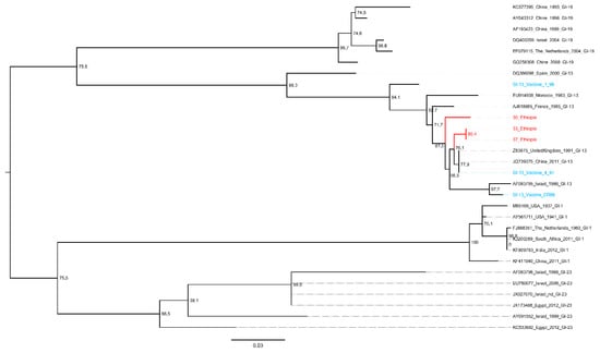 Comparison of the obtained sequences with the reference ones demonstrated a relatively high percentage of identity with the oldest known isolate of this genotype, EU914938-Morocco-1983 GI 13 (nucleotide identity of 95.4%), as well as with Z83975 United Kingdom 1991 GI-13 (nucleotide identity of 98–99%) and JQ739375|China-2011-GI-13 (nucleotide identity of 98–99%). However, when a broader 793B dataset was evaluated, a closer phylogenetic relationship was observed with strains collected in India and China (Supplementary Materials Figure S1).