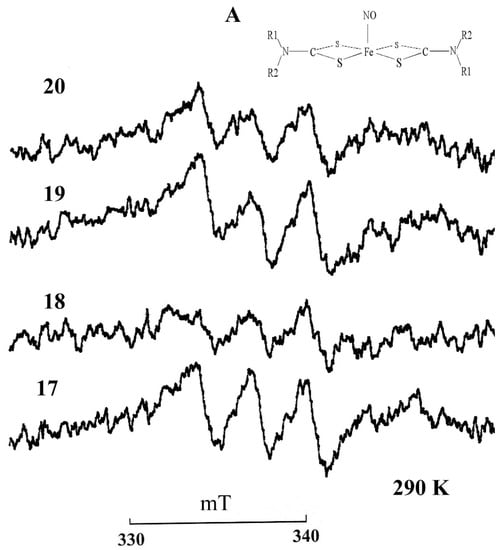 - Mikoyan, V.D.; Kubrina, L.N.; Serezhenkov, V.A.; Stukan, R.A.; Vanin, A.F. Complexes of Fe2+ with diethyldithiocarbamate or N-methyl-D-glucamine dithiocarbamate as traps of nitric oxide in animal tissues: Comparative investigations. Biochim. Biophys. Acta 1997, 1336, 225–234. [Google Scholar] [CrossRef]