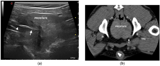 Ultrasonographic and computed tomographic (CT) images of the prostate: (a) Transverse ultrasonographic image of the prostate showing a spindle-shaped hyperechoic foreign body consistent with a grass awn; the tip (arrowhead) and barbs (arrow) of the awn are evident. (b) Transverse CT image of the prostate showing a capsular irregularity localized in the ventro-lateral right prostatic lobe, suggestive of periprostatic tissue reactions.