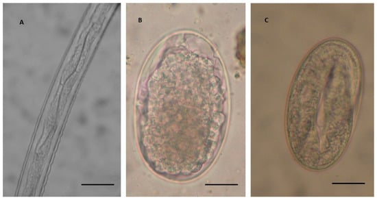 Detail of the body of third stage larvae (L3) of cyathostomin (A), showing eight intestinal cells of which the first four are arranged in a double row and the second group of four cells are in a single line (magnification 400×). This typology of L3 was identified as Cylicostephanus spp. (Cylicostephanus hybridus, Cylicostephanus calicatus and Cylicostephanus longibursatus) according to Bevilaqua et al. [], and as type C L3 according to Santos et al. []. Scale bar: 50 µm. (B) Undeveloped cyathostomin egg and (C) developed cyathostomin egg containing a first stage larva (magnification 400×). Scale bars: 20 µm.