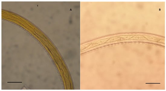 Detail of the body of two cyathostomin third stage larvae (L3). (A) L3 showing eight triangular intestinal cells, where the first two are arranged in a double row and the remaining six cells in a single row (magnification 400×), identified as a group 2 L3 (Cylicocyclus nassatus, C. radiatus, C. insigne, Cylicostephanus minutus, and Cyl. poculatus) according to Bevilaqua et al. [], and as a type A L3 (C. nassatus, C. insigne, C. radiatus, Cyl. minutus, Cya. catinatum, Cya. pateratum, Petrovinema poculatum) according to Santos et al. []. (B) Type G L3 according to Santos et al. [], showing eight trapezoidal intestinal cells with an uncharacterised arrangement. Scale bars: 50 µm.